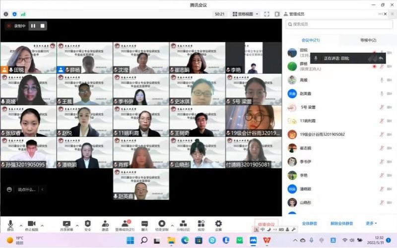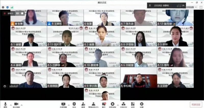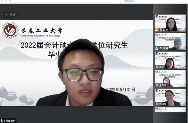 2022年5月31日下午12点30分,永利官方网站MPAcc教育中心根据学校研究生院研究生培养工作的总体安排和部署,组织了2022届MPAcc硕士毕业答辩。本次毕业答辩采用了腾讯会议线上答辩的方式,下设了4个答辩小组,共涉及54名学生。其中19级会计专硕52人,18级会计专硕2人。答辩过程全程记录,同时低年级同学也可进入会议进行观摩学习。