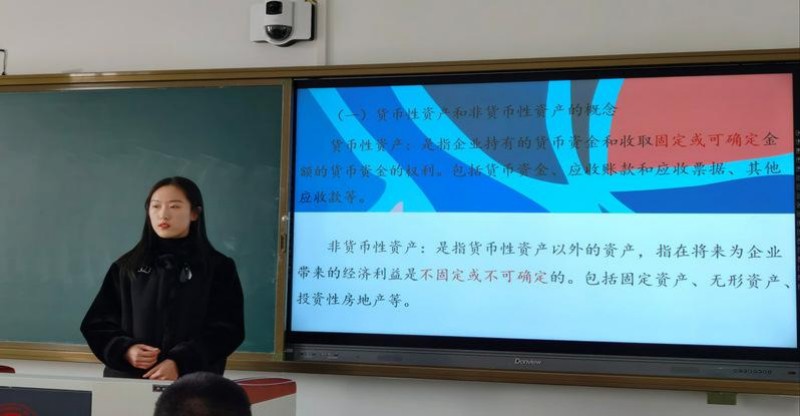 随后由朱悦萌同学为我们带来非货币性资产交换的相关知识。她从非货币性资产交换的概念、确认与计量和会计处理三个方面来介绍。在介绍的过程中,她通过结合例题的方式,对所介绍的相关理论知识进行详细论述。在讲解过程中,将每一处数据来源每一步分录都清晰明确的介绍,对待老师和同学的提问也毫不含糊,做到知无不言言无不尽。