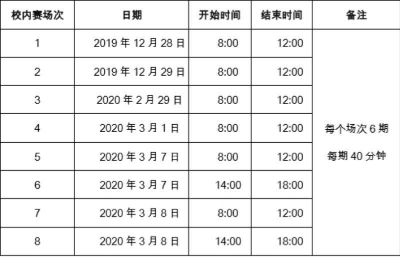 (二)大赛校内赛时间安排:2019 年 12 月 4 日起,即可通过大赛官网申请校内赛,校内赛各场次的具体时间安排请关注大赛官网通知。