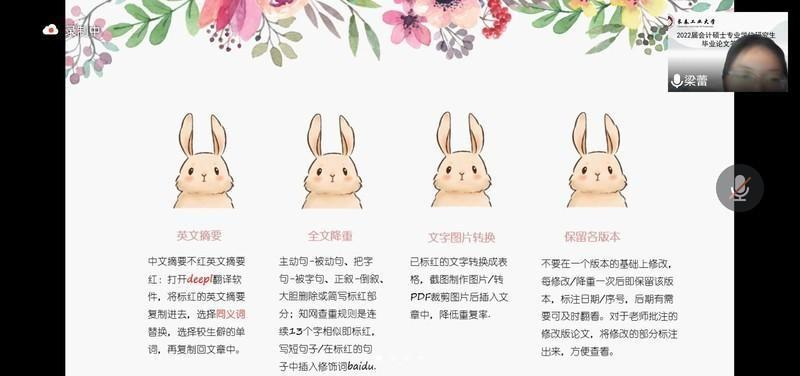 在开题阶段,她建议尽量选择参考文献较多的方向作为自己的论文研究方向,降低论文行文难度;在中检阶段,通过寻找官网公告或者上交所和深交所的证券信息,加强论文数据支撑,行文时注意图表结合,并注意美化图表为论文加分;在降重环节,她建议保留每个查重版本并标上日期,方便后续查看。细心的梁蕾同学提议:将每次论文中修改的部分标注出来,方便老师审阅。