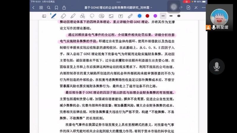 首先韩星媛同学为我们分享论文《基于GONE理论的企业财务舞弊问题研究——以欣泰电气为例》。她先从三个关键词“GONE理论”、“财务舞弊”和“欣泰电气”入手,为大家简要地讲述了该文章的关键词。最后韩星媛同学又为大家梳理了整篇文章的结构脉络,并建议大家文章中应该多使用图表代替大量的文字描述。