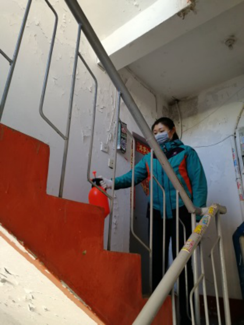 在防控志愿服务期间,我对辖区内公共区域及无物业小区楼道口进行消毒,争取做到全覆盖;并登记外地返程人员信息,确保不落一户不漏一人。