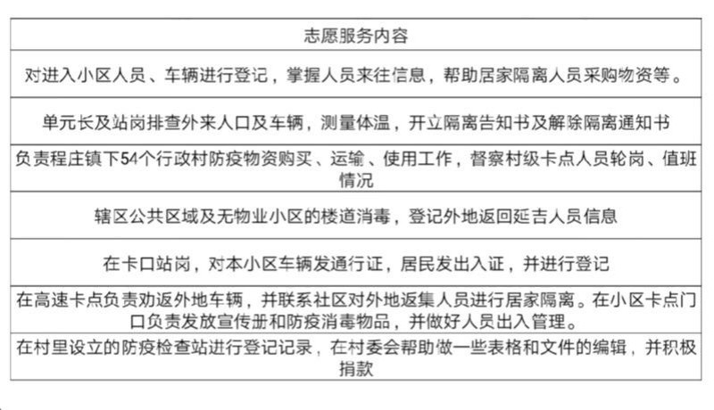 我的家乡是吉林省延边朝鲜族自治州延吉市,同全国各地一样,除了一线的医护人员外,社区是疫情防控的重要关口。外地返程人员排查要靠社区;向居民宣传防疫知识要靠社区;潜在隔离人员的24小时看护要靠社区;关爱隔离人员的生活,为他们倒垃圾、买菜等都要靠社区工作人员,以确保他们生活无碍。社区工作人员肩负重任但人员有限。因此我选择在此次疫情防控期间联系所在社区做青年志愿者。