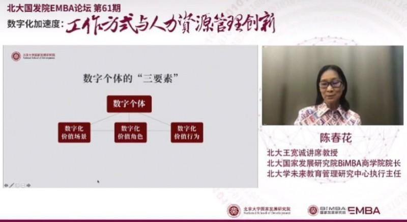 2022年3月26日晚,北大国家发展研究院BiMBA商学院院长、北大学未来教育管理研究中心执行主任陈春花教授为我们带来了一场主题为“数字化加速度:工作方式与人力资源管理创新”的精彩演讲。本次直播由北大国发院BiMBA商学院助理院长、EMBA中心主任柴豫荣主持,全体会计硕士在纪晶华教授的组织下观看了本次直播。