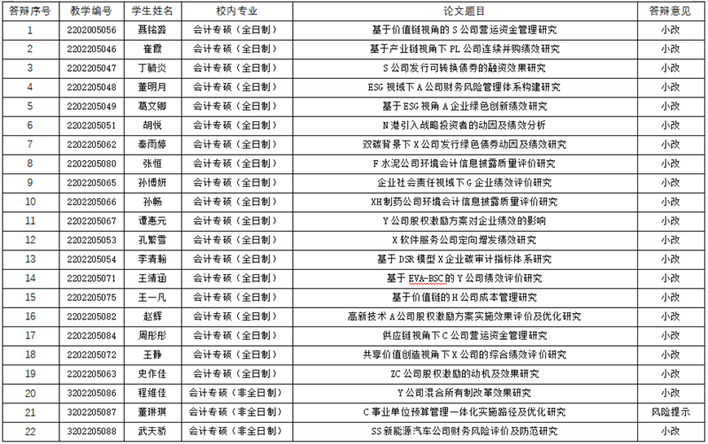 此次预答辩应参加人数为45人,实参加45人,全部通过预答辩。其中3名同学论文给与风险提示,需重点修改完善。详细情况如下: