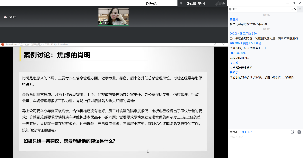 讲座中,孙琳琳以“面试选拔人才时,我们平均做出的时间?”这一问题作为讲座的开始,抛砖引玉,充分的调动起了同学们的好奇心与求知欲。之后通过“焦虑的肖明”与“烦恼的季阳”两个案例讨论,与同学们进行了充分的互动与深度的交流,由浅入深,讲述了如何管理好自己、管理好团队,让同学们对成为一个优秀的管理者需要哪些能力与技能有了充分的了解。由此引出我们在面试时,面试官的面试标准,以及在面试时面试官注重三个能力——经历、能力与潜力。同时也为大家讲解了结构化面试中经常用到的STAR面试法,并用生动的例子让同学们情景带入,详细的讲述怎么将STAR运用到实际面试中,在面试中得到更高的分数。