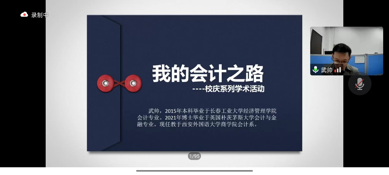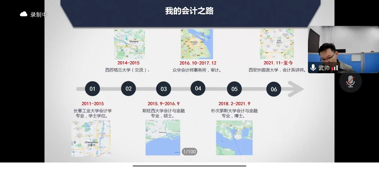 会议开始,财会系主任纪晶华教授向参会师生简要介绍武帅的个人经历。2011年入学,曾担任110514班班长。2021年博士毕业于英国朴茨茅斯大学会计与金融专业,现任教于西安外国语大学商学院会计系。接下来主讲人武帅分享了从大学-硕士-工作-博士-教师的求学成长之路,为大家讲述不同阶段的收获与感悟。他深情回忆了在永利官方网站时的本科时光,细数曾经的老师以及林园校区的快乐生活。他曾经的审计工作经历让他拥有了丰富的实践经验,让他在工作岗位上展现自我;海外的留学经历帮助他丰富了学识,增添了人生阅历。有硕博留学经历的武帅详细地向同学们介绍了意大利、英国、美国会计行业发展历史,并指出了三个国家对会计行业发展的巨大贡献与影响,建议有留学深造想法的同学们可以继续深造会计相关专业。