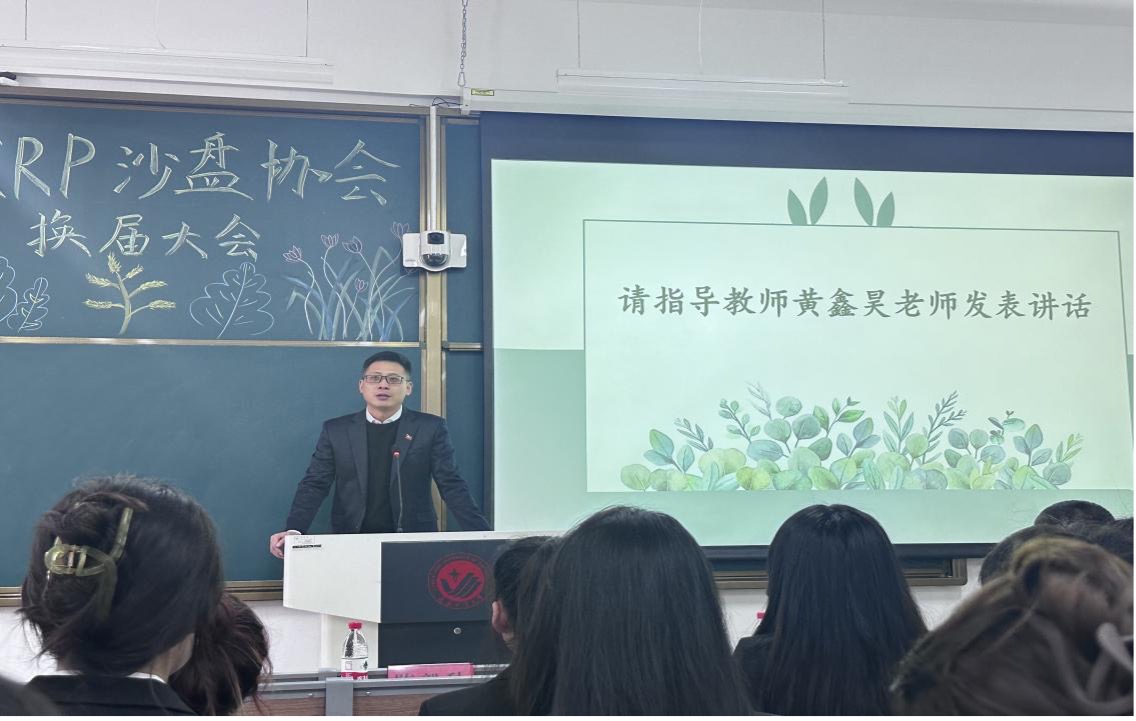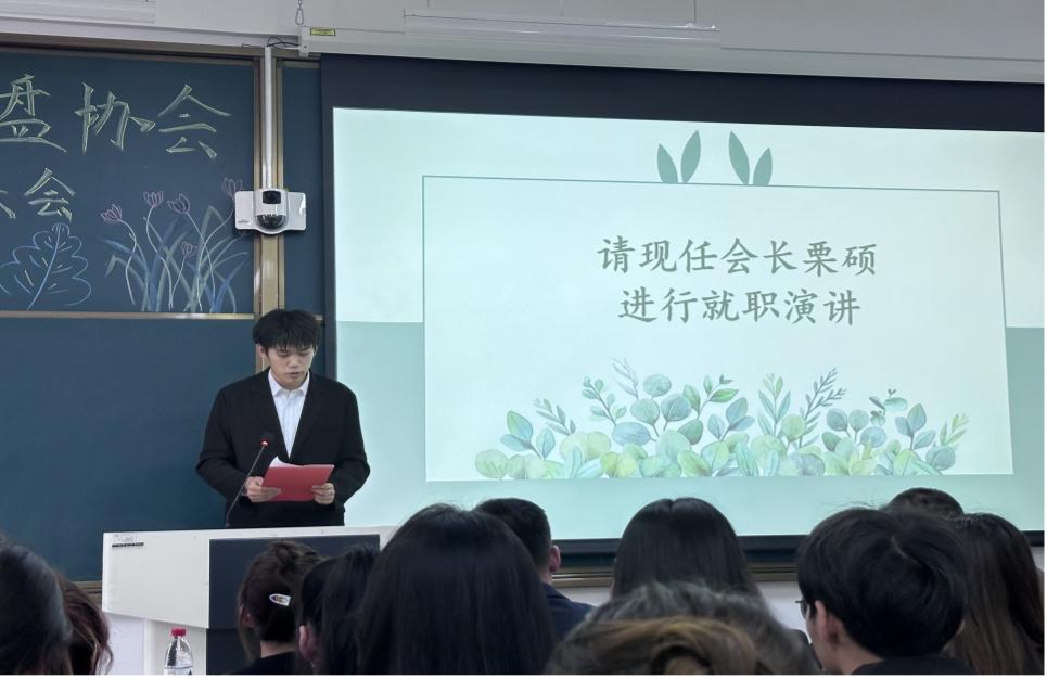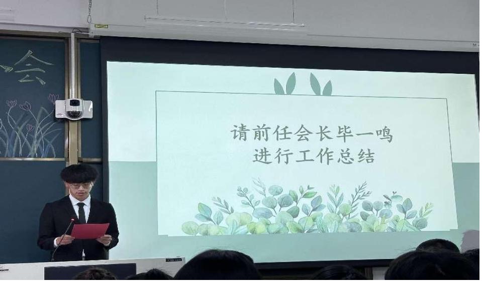 会议第二项,前任会长毕一鸣进行演讲。总结协会上学年取得的工作成果、收获和不足,同时表达了对未来沙盘协会的美好期许和祝福。