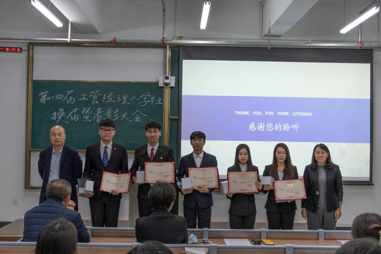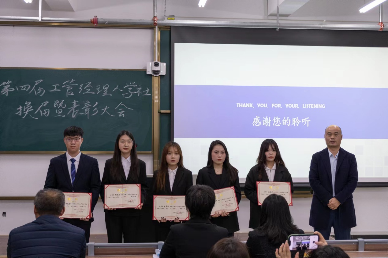 工商管理系工管经理人学社换届暨表彰大会在老师的祝愿与希冀声中、在同学们雷动的掌声里落下了帷幕。相信新生同学会在此次换届表彰大会中受到极大的鼓舞与激励,从而积极参与到学科专业竞赛活动中来。学社未来的活动一定会越办越精彩,新一届学社成员也将会秉承学社严谨、务实、拼搏、团结、知行合一的系风和学风,踔厉奋发,超越自我,引领工管经理人学社开启新征程!