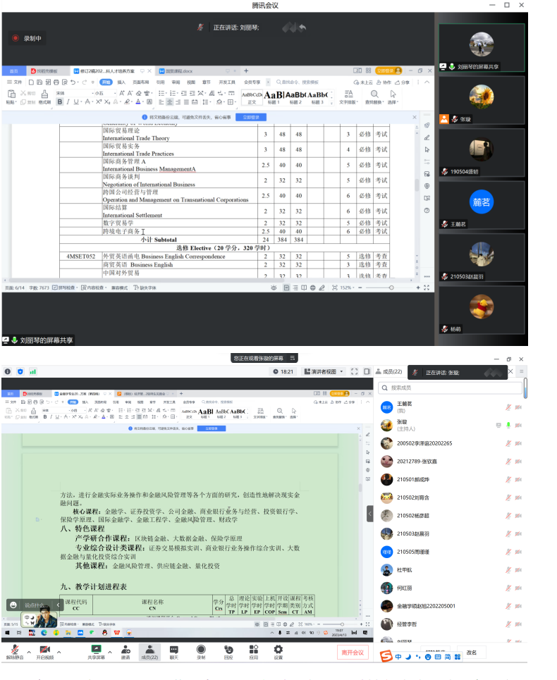 张璇主任首先向大家阐述了人才培养方案修订的重要性,对毕业学生代表的到来表示欢迎和感谢。接着经济系主任张璇、副主任刘丽琴分别就金融学专业和国贸专业的人才培养方案修订情况和与会学生代表进行了深入探讨,各位学生代表也围绕人才培养方案的课程设置等提出了许多宝贵建议。