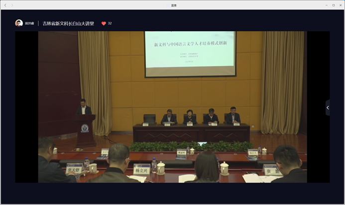 本次大讲堂围绕人才培养模式创新实践,探讨服务我省“一主六双”和“六新产业”建设等重点领域的需求,助推新文科研究走深走实。通过提升新文科思想引领力、文化浸润力、成果转化力,打造一批体现吉林全面振兴、全方位振兴的标志性成果。活动邀请了教育部新文科建设工作组组长、全国新文科教育研究中心主任、山东大学国家治理研究院院长、山东大学原校长、党委副书记、教育部专业设置与专业建设委员会副主任委员樊丽明教授、吉林大学文学院院长张丛皞教授、吉林师范大学文学院院长孙艳红教授等专家分别做了题为《新文科建设的宏观态势与微观机制》、《新文科与中国语言文学专业发展的新趋势》、《新文科与新课标:语言卓越教师培养模式构建》的报告。
