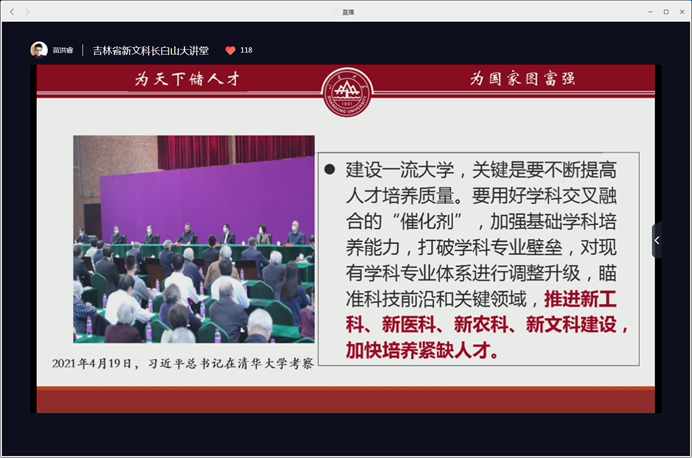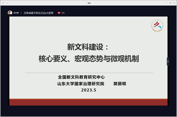学院网讯(通讯员 刘泰然)2023年5月9日,由吉林省教育厅主办,吉林师范大学承办的吉林省新文科“长白山大讲堂”隆重举行, 本次大讲堂采取线上线下相结合的形式进行,管理科学与工程系组织教师参加了此次活动。