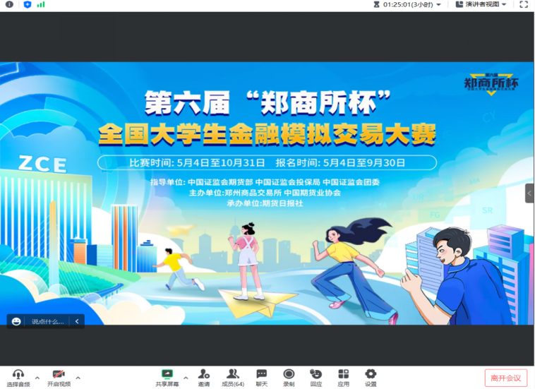 紧接着,高雪峰经理针对“郑商所杯”全国大学生金融模拟交易大赛的比赛背景、赛事内容和报名方法等相关事项进行了详细讲解。据悉,为响应推动投资者教育纳入国民教育体系的号召,在中国证券监督管理委员会期货部、证监会投保局及证监会团委指导下,郑州商品交易所联合中期协主办本次比赛,大赛累计参与高校上千所,是极具影响力的专业赛事。
